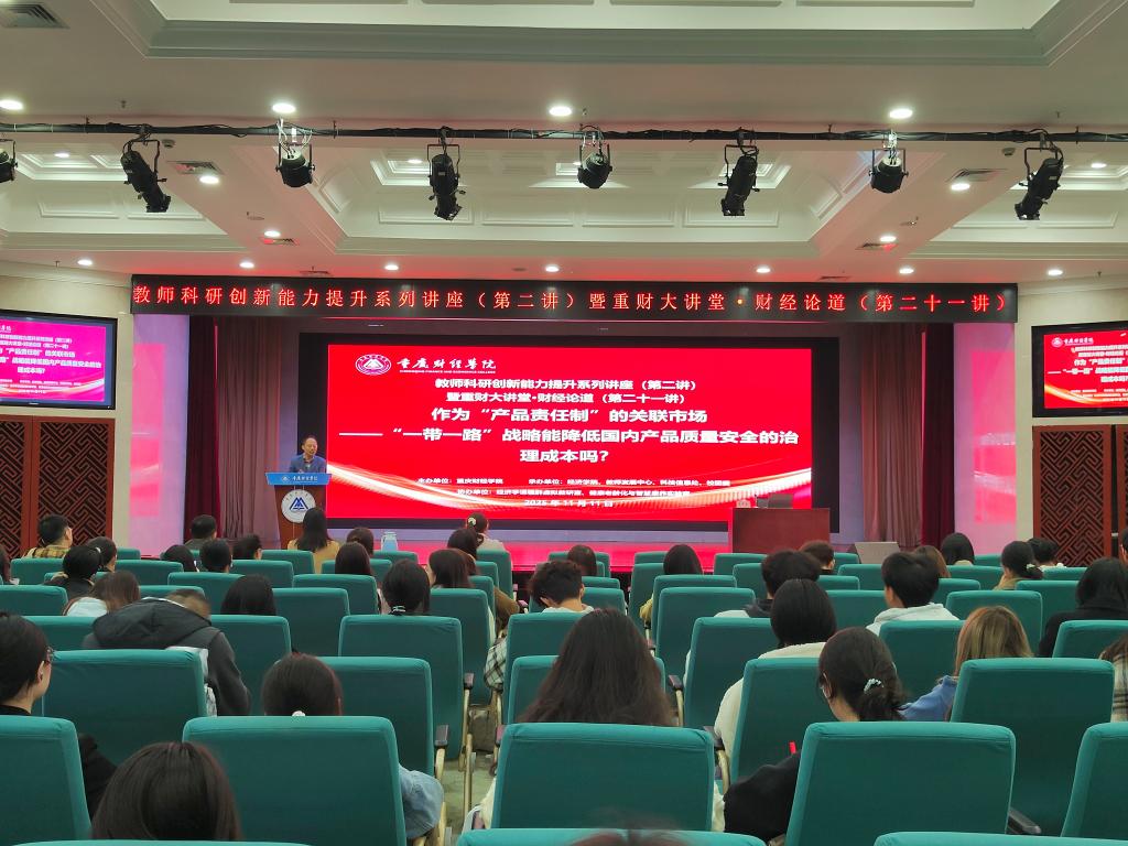 2025年11月11日下午,教师科研创新能力提升系列讲座(第二讲)暨重财大讲堂·财经论道(第二十一讲)在我校学术报告厅成功举行。本次讲座特邀浙江工商大学经济学院教授、博士生导师李井奎教授以“作为‘产品责任制’的关联市场——‘一带一路’战略能降低国内产品质量安全的治理成本吗?”为题,为百余名师生带来了一场理论与实证的思想盛宴。本次讲座由经济学院首席教授李政军主持,经济学院院长宋湘琴、副院长刘春兰以及学校师生共同参加。